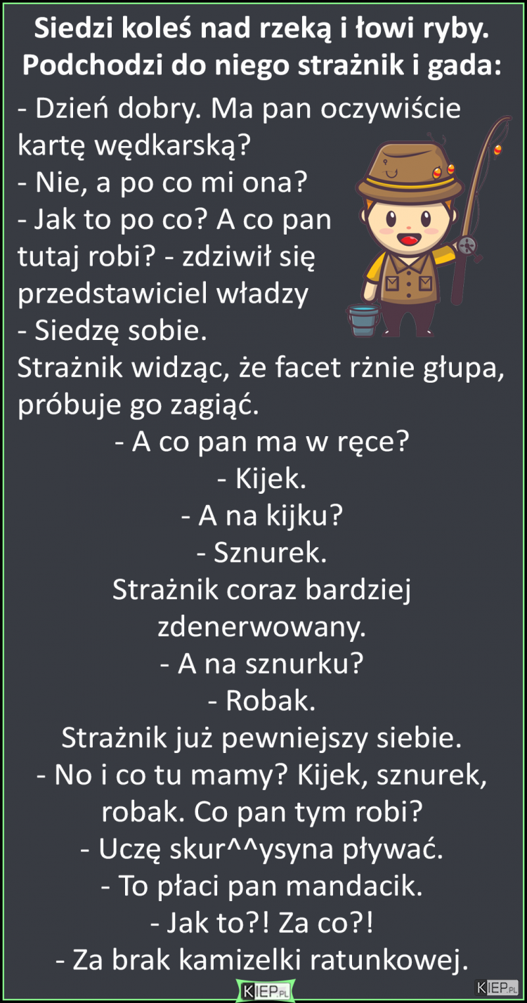 Siedzi koleś nad rzeką i łowi ryby. Podchodzi do niego strażnik i gada...